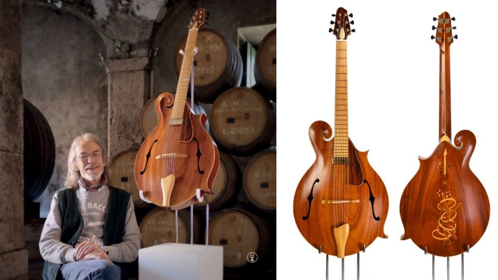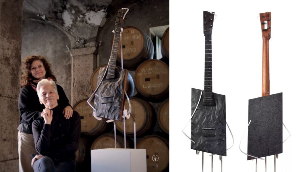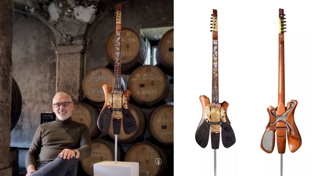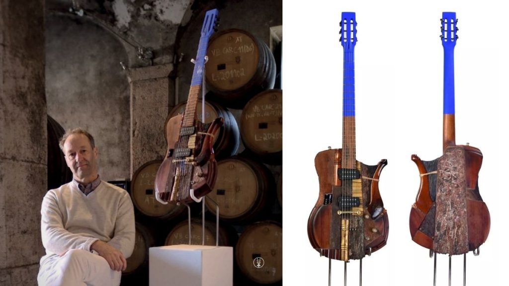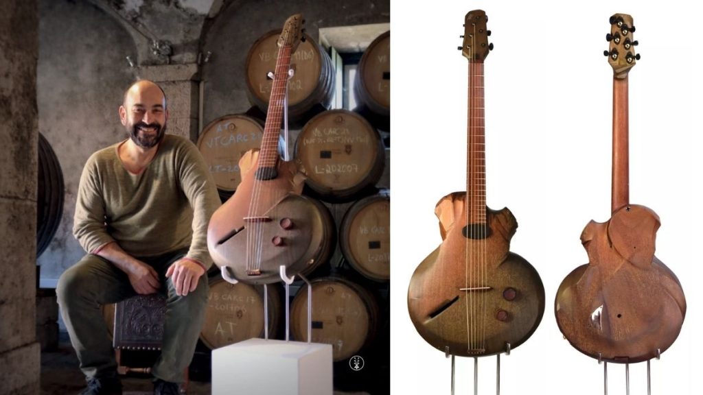 Claudio and Claudia Pagelli were the first to share their thoughts on their one-of-a-kind creation. Claudio explained that their aim was not to make a conventional guitar but to preserve the original form of the selected wood, respecting its story and uniqueness. Their design reveals marks left by the cleaning of the barrel, a task so demanding it required a child to enter through its tiny opening to perform manual maintenance. The guitar’s front evokes the tumultuous waves of the tsunami that struck Lisbon, with the fire that consumed the city immortalised along the ebony fretboard. The undulating metal bars were meticulously affixed to grant the guitar full playability, while the tuning pegs were designed following eighteenth-century violin-making criteria. The most impressive feature of this atypical guitar, however, lies in its frets, which employ the “True Temperament” method, a technique using wavy shapes to achieve perfect intonation.