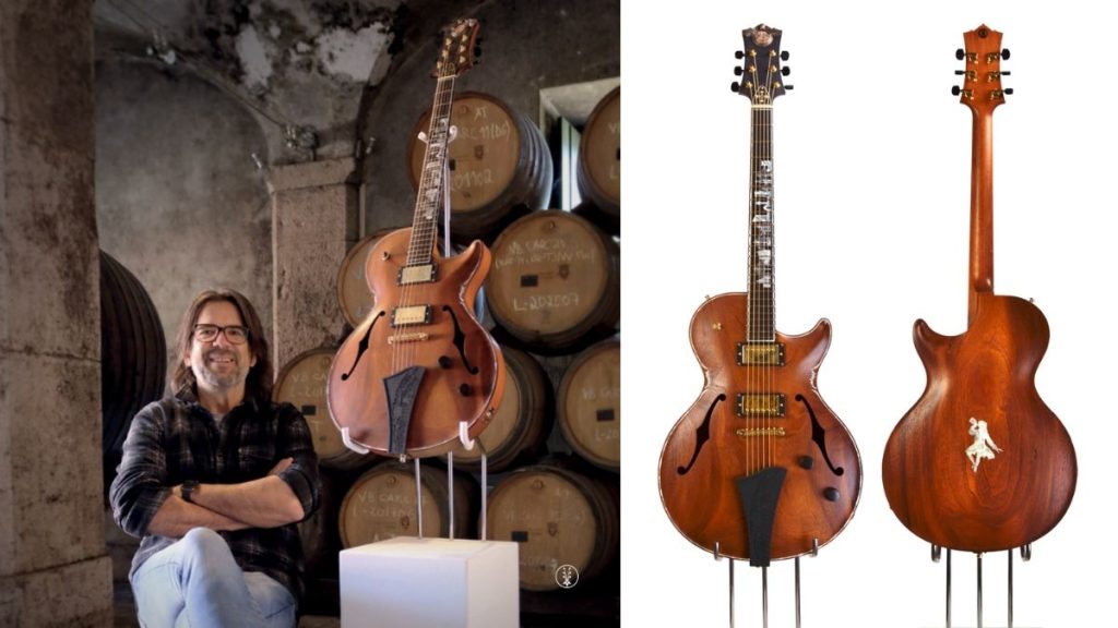 The Guitar Barrel Project, also known as Guitars of the Marquis, originates from the discovery of mahogany barrels believed to have belonged to the wine cellar of the Marquis of Pombal in eighteenth-century Oeiras. This discovery by Portuguese luthier Adriano Sérgio set the foundation for crafting six unique guitars that will never be replicated, honouring the rich history of this precious wood. Inspired by the earthquake that devastated Lisbon on All Saints’ Day in 1755 – a disaster that ushered in the Age of Enlightenment, a time marked by the triumph of scientific thought and political revolutions – these exceptional instruments were unveiled on 14 May 2023 in the cellar of the Marquis of Pombal’s Palace. The project brought together master luthiers from Europe: Nik Huber (Germany), Andy Manson (United Kingdom), Claudia and Claudio Pagelli (Switzerland), Michael and Tania Spalt (Austria), Ulrich Teuffel (Germany), with Adriano Sérgio representing Portugal.
